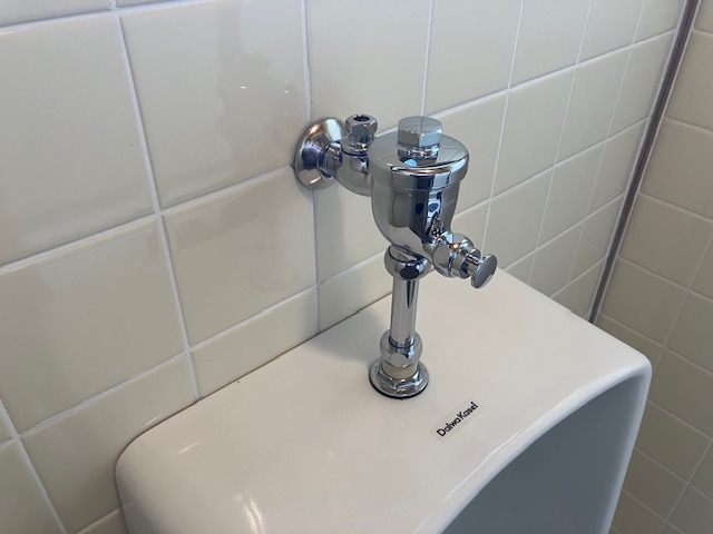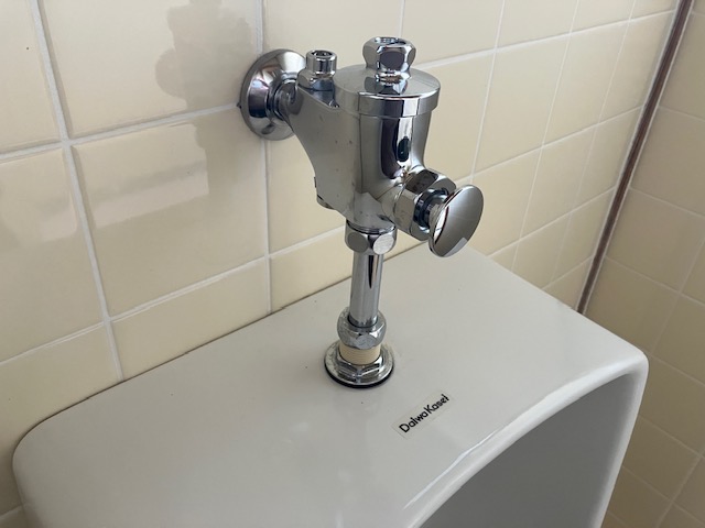 男性用トイレの上部のステンレス部分(フラッシュバルブ)のボタンが壊れたためこの部分だけを交換いたします。
